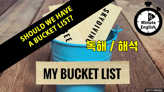 탱고 춤 추기, 마술 하기, 스카이다이빙 하기와 같은 것을 배우고 싶다면 버킷 리스트를 작성해 보세요. 버킷 리스트란 당신이 죽기 전에 하고 싶은 것을 목록으로 만든 것입니다. 리스트는 멋지게 보일 수도 있지만 다른 사람을 흉내내는 것에 불과하다는 비난을 받을 수도 있습니다. 버킷 리스트는 다른 사람들이 앞서 살아 간 완벽한 삶을 소개함으로서 다른 사람의 생각에 종속되게 만들기도 합니다. 닐과 샘이 이 문제에 관해 논의합니다. 이 과정에서 유용한 어휘를 우리에게 가르쳐 주고 있습니다.