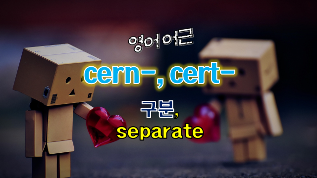 영어어근 cern-은 앞서의 라틴어 certus, certare, cernere를 어원으로 합니다. 영어에 적용된 어근의 형태로는 cern-, cer-, cert- 등입니다.