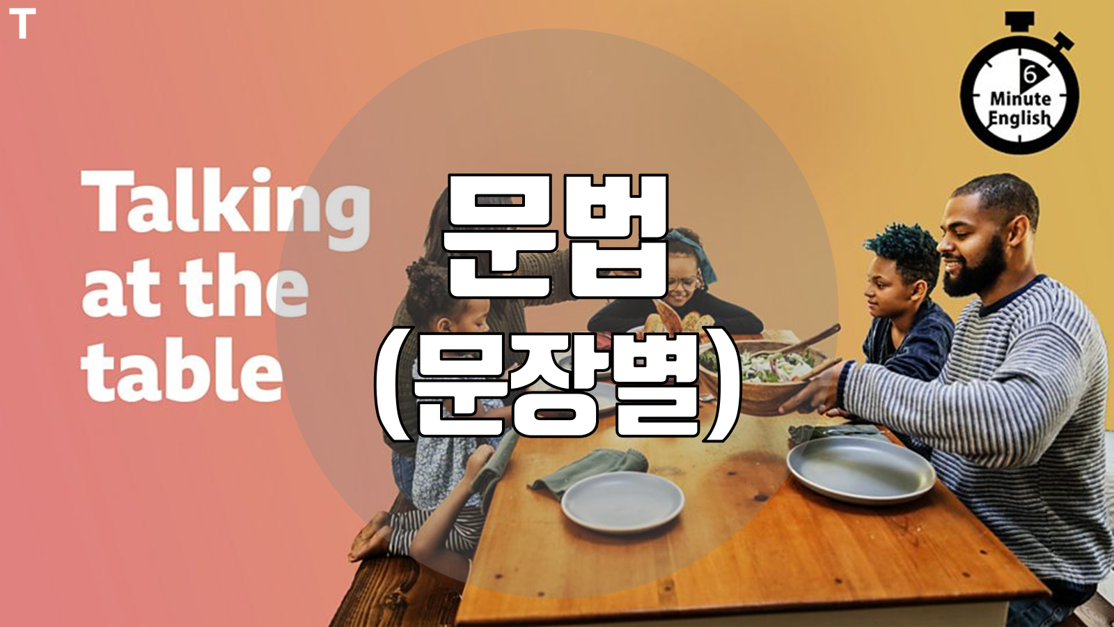 | BBC Learning English 문법 강좌(항목별) - Talking at the table [BBC 6분 영어] (0) | 2024.05.09 |