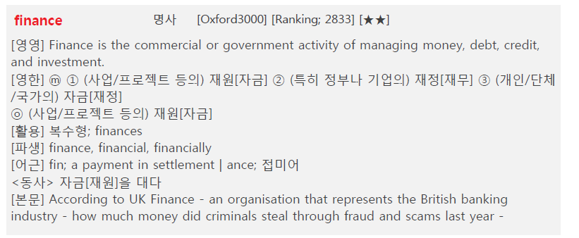 각 개별 어휘 자료에는 다양한 정보들이 포함되어 있습니다. 어휘 정보는 다음의 모습과 비슷하게 정리되어 있을 것입니다. 아래 그림은 Finance란 단어의 정리 내용입니다.
