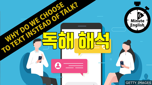 이 자료는 BBC Learning English 코너의 6 Minute English가 매주 재공하는 스크립트를 직역한 것입니다. 이번 주 스크립트의 주제는 'Why do we choose to text instead of talk?' 입니다. 해석은 철저하게 직역하였습니다. 관계대명사나 긴 부정사나 동명사구, 삽입구 등은 이해를 위해 []를 사용해 묶었습니다. 이 글의 목적은 번역이 아니라 원문을 영어적으로 이해하는 것이기 때문입니다.